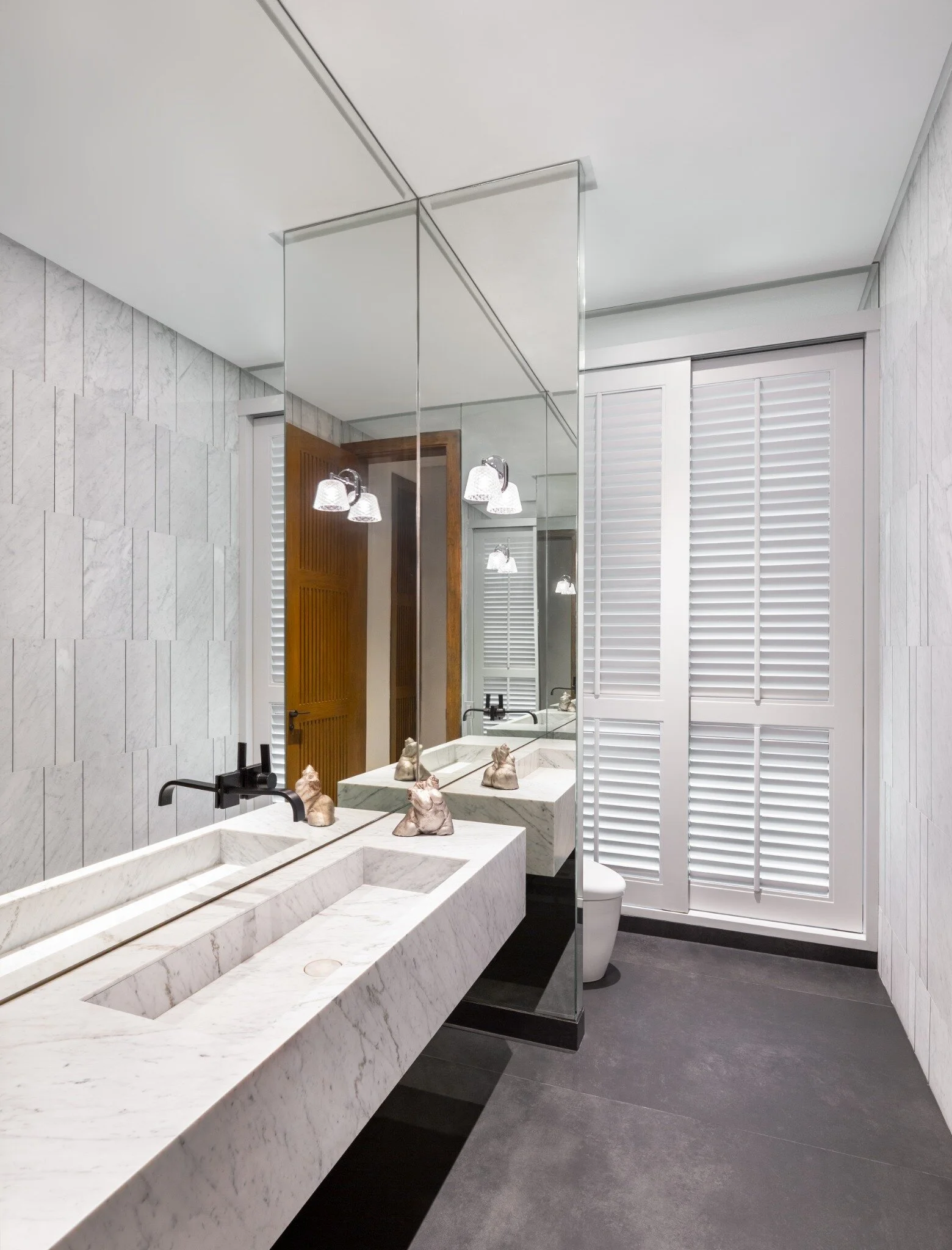 The his-and-hers en suite bathrooms mirror each other with 3x1-metre shower stalls with utility benches, panoramic windows opening onto privacy-shielding greenery, and 1.5x3-metre tiles imported from Italy add elegance to the space.