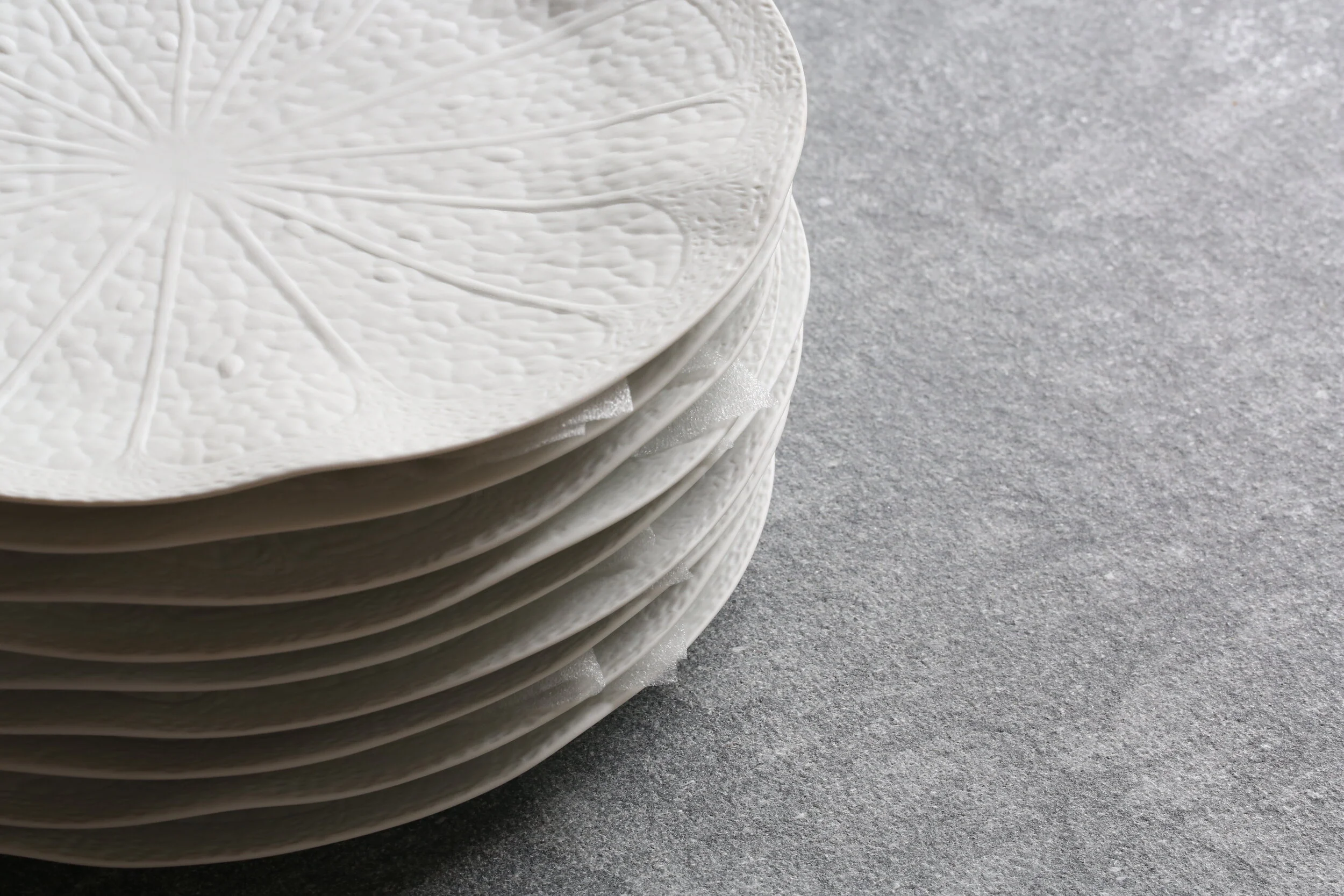 Due to the unglazed nature of the porcelain, these are meant to be used as charger plates. Liquid such as sauces may permanently stain the surface.